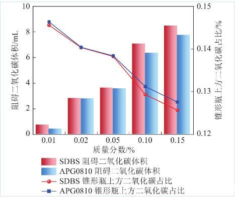 圖12為注入二氧化碳的氣相色譜檢測結果,計算出表面活性劑泡沫對二氧化碳的緩釋作用結果如圖12柱狀圖所示。相同質量分數(shù)下,SDBS溶液對二氧化碳的緩釋效應優(yōu)于APG0810。然而兩種表面活性劑對二氧化碳緩釋效應均不顯著,SDBS表面活性劑溶液在質量分數(shù)最大時10 min內(nèi)只控制了8.46 mL二氧化碳氣體,APG0810只控制了7.74 mL二氧化碳氣體。