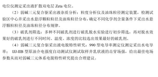 本文主要利用了OMEC PIP9.0型顆粒圖像分析儀檢測弱堿三元驅乳狀液乳化程度;動態界面張力儀檢測弱堿三元采出液油水界面動態界面張力;DHR-2界面流變儀測定弱堿三元復合驅采出液界面強度;ZetaPALS電位儀檢測弱堿三元驅采出液擴散雙電層電位;BT-9300H型激光粒度分布儀測定弱堿三元復合驅采出污水中懸浮固體粒徑以及油珠粒徑分布;多種不同破乳劑進行破乳脫水實驗進行初步篩選,再對脫水效果好的破乳劑進行不同時間、溫度、濃度的比較選出效果最好的破乳劑;990型電導率測定儀測定采出水電導率;IJJ-IIB型原油介電強度自動測試儀測試取樣井在不同時期,不同化學劑含量下的擊穿場強。