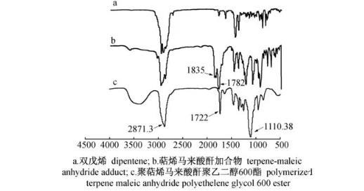 工業雙戊烯中除了百分之十左右的α-松油烯具有共軛雙鍵能直接與馬來酸酐發生D-A加成反應外,γ-松油烯、雙戊烯等均需在催化劑作用下發生異構化,轉化為以α-松油烯為主的含有共軛雙鍵的單環單萜才能與馬來酸酐發生反應生成萜烯馬來酸酐加合物,萜烯馬來酸酐加合物再分別與聚乙二醇(400,600,1 000,2 000,4 000)進行反應得到對應的目標產物,分別為聚萜烯馬來酸酐聚乙二醇400酯(Ⅰ),聚萜烯馬來酸酐聚乙二醇600酯(Ⅱ),聚萜烯馬來酸酐聚乙二醇1000酯(Ⅲ),聚萜烯馬來酸酐聚乙二醇2000酯(Ⅳ)和聚萜烯馬來酸酐聚乙二醇4000酯(Ⅴ)。