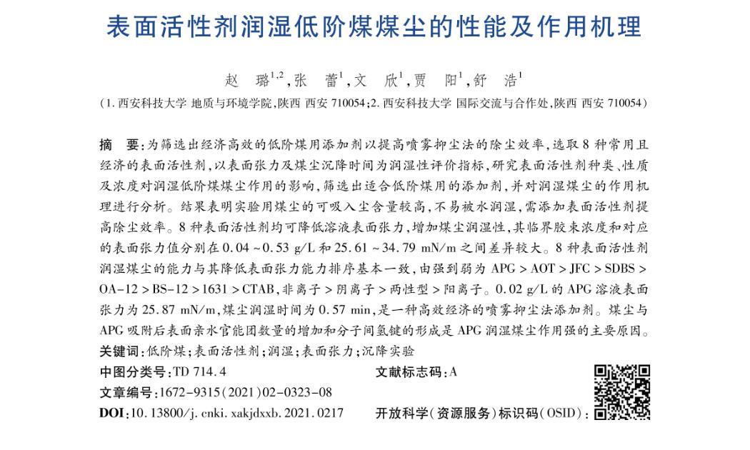 低階煤在中國儲量豐富且富含高附加值油氣資源,可以高效分質利用,為緩解我國石油資源緊張和環境污染局面提供了新的可能,逐漸成為新的關注點。近年來隨著低階煤開采量的增大,采煤機械化程度的提高,全機械化工作面上的煤塵濃度可達3 000 mg/m3,遠超國家職業衛生標準中的要求。長時間暴露于超標的煤塵環境是礦工患塵肺病的重要誘因之一。塵肺病發病率高且無法治愈,2018年,全國報告的職業性塵肺病19 468例,占到了各類職業病新病例總數的8285%,且發生率還有上升趨勢。此外,井下煤塵濃度聚集到一定程度還會引發爆炸,造成更大的人員傷亡和經濟損失。因此,有效抑制礦塵對煤礦安全生產和礦工的職業健康安全都至關重要。目前常用的措施包括通風除塵、煤層注水、噴霧灑水等,這些技術對降低作業點的粉塵濃度都起到了重要作用。低階煤的煤化程度較低、揮發分及灰分含量高、含水率高、含氧多、孔結構豐富,與其他煤種相比通常更易被潤濕,因此適用噴霧抑塵。噴灑自來水的除塵效率只有不到60%,向水中加入表面活性劑可以增加煤塵潤濕性和滲透性,提高除塵效率?;瘜W表面活性劑的選擇受自身性質、結構、煤塵表面官能團、煤塵帶電性質等多種因素的影響,其選擇具有特異性和專一性,目前關于抑制低階煤煤塵添加劑的研究還較少。篩選出常用且經濟的表面活性劑作為添加劑提高低階煤煤塵的除塵效率具有積極意義。