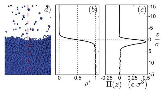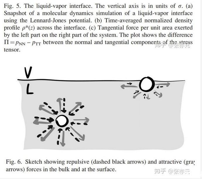 當分子間距較小時,斥力為主,分子間距較大時,引力為主。在斥力與引力平衡時,Lennard-Jones勢能最小。現(xiàn)在,我們就可以來詳細地考慮液-氣界面了。圖5a是通過分子動力學(xué)仿真得出的液-氣界面照片,對應(yīng)的時間平均密度分布圖是圖5b。從高密度的液體到低密度的氣體發(fā)生在一個幾個分子厚度的窄區(qū)域。為了確定毛細力,我們沿垂直界面方向?qū)⑾到y(tǒng)分為兩個子系統(tǒng)(圖5a)。考慮左邊子系統(tǒng)對右邊子系統(tǒng)的單位面積的作用力,即應(yīng)力,在豎直方向上的分布。這個力有兩個來源:壓力P和額外壓力Π(圖5c)。圖5c表明有個力局部存在于界面附近,其實這個力就是表面張力,且這個力范圍和密度突變的范圍很相似。這說明表面張力的確是一個真實的力,而不僅僅是表面能的一種純數(shù)學(xué)描述。既然我們發(fā)現(xiàn)在界面附近的確局部存在一個平行的力,那我們回到問題1,為什么表面張力平行于界面而不是垂直于界面?我們注意到圖1僅僅描繪了分子間引力作用。更全面的圖應(yīng)該如圖6所示,包含了引力與斥力作用。在遠離界面的液體本體內(nèi),由于液體分子周圍的完全對稱性,分子的受力完全平衡。但是,靠近界面附近的地方,上下對稱性被打破。為修復(fù)豎直方向的力平衡,向上的斥力需平衡向下的引力。而在平行于界面的方向,對稱性仍然存在,平行于界面方向的力平衡仍然存在。這就可以存在一種情況,引力作用的強度與斥力作用的強度不同。實際上,在界面附近的水平方向上,引力作用比斥力更強,這產(chǎn)生了表面張力。