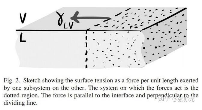 熱動力學(xué)觀點和力學(xué)觀點可以用虛功原理聯(lián)系起來。圖1中的界面處的分子明顯受到一個垂直于界面方向的力,但圖2中的力明顯平行于界面,那么第1個關(guān)鍵問題就是:為什么表面張力是一個平行于界面的力,即使它似乎一定垂直于界面?