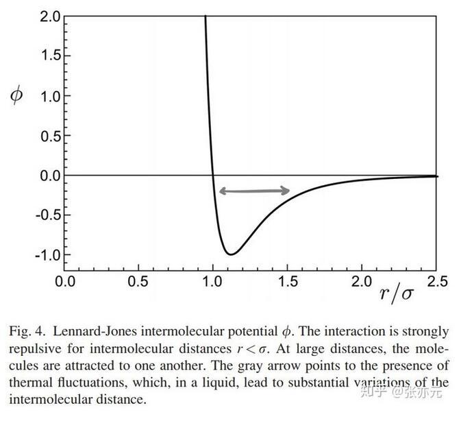 為了從源頭上理解毛細現(xiàn)象和表面張力,我們首先要考慮的就是液體分子間的作用力。事實上,一對液體分子間的作用力要么是引力,要么是斥力,與兩分子間距離相關(guān),一般可用Lennard-Jones勢能表示(圖4)。
