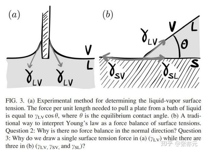 測量液-氣表面張力的標準方法是測量將金屬板拉出水面的力,這個力與表面張力γLV相關(guān)(圖3a)。而對楊氏方程(圖3b),一般認為在接觸線處存在三個界面張力在固-液界面方向的力平衡γSL+γLVcosθ=γSV。初學(xué)者在此處會有以下困惑: