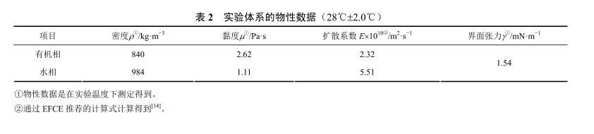 實驗運行穩定后,從塔頂和塔底的出口處采樣,用滴定法測定樣品中丁二酸的濃度。分散相滯存率的測定采用體積置換法,液泛條件通過增大兩相流速直到發生液泛來測得。實驗體系的物性數據見表2。