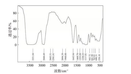 TPHS表面活性劑的紅外光譜譜圖如圖2所示。其中,3351 cm-1處為分子間氫鍵、羥基O—H的伸縮振動峰;1356 cm-1處為羥基O—H的面內彎曲振動峰;2880 cm-1處為甲基C—H的伸縮振動峰;1230和1117 cm-1處為磺酸鹽S=O鍵的不對稱伸縮振動峰;696、762和841 cm-1處分別為苯環芳烴鄰位、間位、對位的C—H鍵的面外彎曲振動峰;1460 cm-1處為苯環骨架C—C伸縮振動峰;1960和2094 cm-1處為苯環上C—H的伸縮振動吸收弱的倍頻譜,538 cm-1處為取代苯環的面外彎曲振動峰,證明所合成的表面活性劑為目標產物。