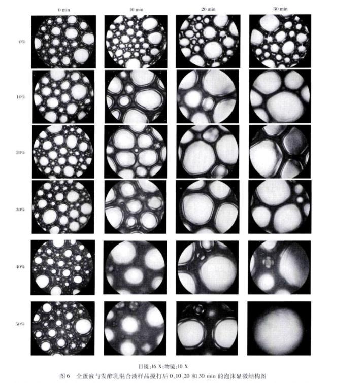 圖6為全蛋液與不同量的ST5-24 h發酵乳混合物經過攪打后的泡沫放置0、10、20和30 min時的顯微結構圖,其中目鏡和物鏡的放大倍數分別為16 X和10 X。由圖6可以看出,在0 min時,發酵乳含量為0%~30%的氣泡小而稠密,而40%和50%的氣泡大小不一且稀疏,說明混合液的起泡性在發酵乳含量大于30%時開始降低。此外,在發酵乳含量較少時,氣泡之間連接比較緊密;而發酵乳含量較高,尤其是在發酵乳含量為50%時,氣泡呈分散狀態,并且在氣泡底部有少量析出的液體(圖中灰色部分)。