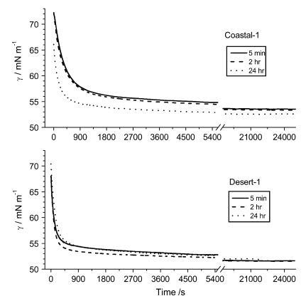 1:1 提取物的動(dòng)態(tài)表面張力測(cè)量 表明達(dá)到平衡的時(shí)間 γLV 從大約 15 分鐘到長(zhǎng)達(dá) 5 小時(shí)不等(圖 1)。 在所有情況下,都有一個(gè)相對(duì)較快的初始速度 γLV 的變化,這可能是擴(kuò)散受限的,和 然后是一段長(zhǎng)時(shí)間的低利率 γLV 的變化。 平衡達(dá)到率低的時(shí)期被假定為至少兩個(gè)過(guò)程的結(jié)果:(i)不同分子之間的表面競(jìng)爭(zhēng) 吸附位點(diǎn); (ii) 表面分子的重排。 時(shí)間之間沒有明顯的關(guān)系 實(shí)現(xiàn)不同的平衡 γLV 和提取時(shí)間 土壤(圖 1)。