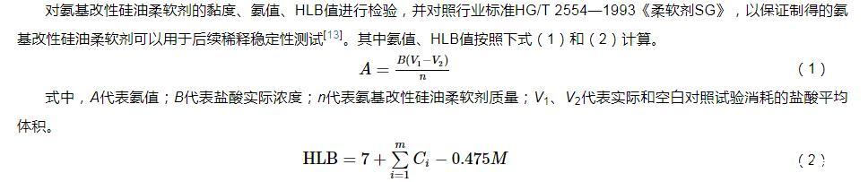 對氨基改性硅油柔軟劑的黏度、氨值、HLB值進(jìn)行檢驗(yàn),并對照行業(yè)標(biāo)準(zhǔn)HG/T 2554—1993《柔軟劑SG》,以保證制得的氨基改性硅油柔軟劑可以用于后續(xù)稀釋穩(wěn)定性測試。其中氨值、HLB值按照下式(1)和(2)計(jì)算。