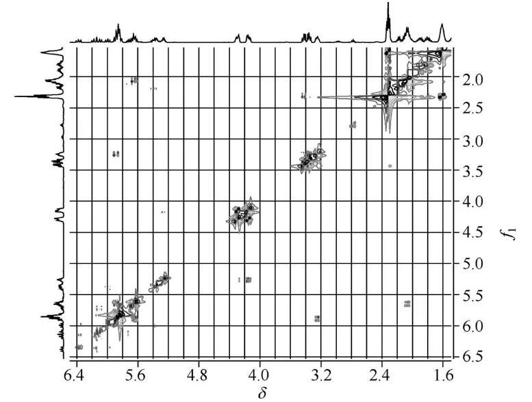 桐油及桐油酸酐的1H NMR見圖2,從圖中可以看出,隨著加成反應的進行,桐油中的烯鍵上的氫信號(8~13),TM2烯鍵上的氫信號(11~17)及TM3烯鍵上的氫信號(11~13)明顯減弱,峰型也發生很大變化。依據圖2(b)中的各峰積分面積比例確定桐油與兩個馬來酸酐反應形成TM2,進一步與馬來酸酐反應,共軛三烯的氫信號[圖2(b)中14~17]完全消失。由于桐油結構較復雜,1H NMR歸屬較困難,TM 2經1H-1H COSY譜(圖3)分析,從圖3中可以看出,信號3和6相關,為甘油酯緊連的兩個亞甲基氫;6′和8相關,為新生成的六元環相鄰的兩個氫;5和5′分別與12和12′相關,7和13、13′相關,9和10相關,11和14相關,14和17相關,12、17與15、16相關。結合圖2(b)、圖2(c)中信號7、8、9的積分比例分別為1∶2∶2及3∶6∶4,及TM2的1H-1H COSY譜分析,TM2及TM3結構各質子信號歸屬如圖2所示。