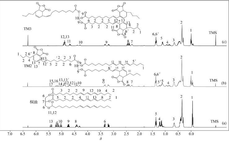 桐油中的共軛不飽和鍵與馬來酸酐易發生Diels-Alder(D-A)反應,生成桐油酸酐,反應條件對產物的分布具有重要影響。由于桐油為混合物,每分子中有3條不飽和鏈,控制MA的加入量及反應條件,可以控制桐油二酸酐(TM2)和桐油三酸酐(TM3)的形成。文獻報道大多數桐油和馬來酸酐反應以有機錫為催化劑,經過研究發現,溫度對馬來酸酐與桐油反應影響較大,溫度低反應很慢,有機錫催化劑并不能明顯降低反應溫度。在無催化劑的條件下,以紅外光譜跟蹤80℃、100℃、120℃及140℃下桐油與3倍量的馬來酸酐反應的情況,結果表明80℃下反應緩慢,100℃反應1h后桐油的共軛三鍵的紅外吸收峰幾乎完全消失,反應程度能達到96%。桐油及桐油酸酐的FTIR如圖1所示,991cm–1為桐油共軛三鍵的面外彎曲振動紅外吸收峰,兩倍量馬來酸酐與桐油反應的產物(TM2)中991cm–1的吸收峰明顯減弱但未消失,3倍量馬來酸酐與桐油反應的產物中該峰完全消失,說明桐油分子上的共軛三鍵可以同馬來酸酐反應形成三酸酐TM3。