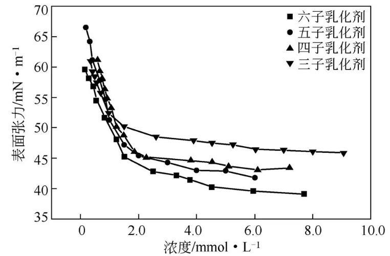 將桐油三酸酐和桐油三酸酐與甲基丙烯酸β羥乙酯反應后的產物TM3H1及TM3H2水解,形成羧基官能團數為4~6的丙烯酸酯改性的桐油基衍生物,TM3H3含有3個羧基。將羧酸改性的桐油用堿等當量中和,形成含3~6個羧酸鈉基團的桐油基衍生物,簡稱為3~6子乳化劑。桐油及乳化劑的表面張力測試結果如圖5所示,與純水(實測表面張力69mN/m)相比,4種多子乳化劑均能降低水的表面張力。表面張力隨其濃度的增加而下降,當乳化劑濃度大于2.5mmol時,溶液的表面張力隨濃度的變化趨于平穩,逐漸接近水平。乳化劑濃度為1.5mmol/L時,3~6子乳化劑表面張力分別為50.2mN/m、48.8mN/m、47.2mN/m和45.2mN/m。