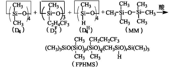 在裝有攪拌器、溫度計、回流冷凝管的四口燒瓶中,按n(D4)∶n(D3F)∶n(D4H)∶n(MM)=1∶1∶1∶1比例依次加入D4、D3F、D4H、MM,攪拌下加熱升溫至50——60℃,緩慢加入濃H2SO4(占單體總的質(zhì)量分?jǐn)?shù)3%),控溫在50——60℃反應(yīng)4 h.后升溫至80——90℃,加適量Na2CO3,反應(yīng)數(shù)小時,使體系pH近5——6,冷卻,靜置,抽濾,得無色透明液體,即中間體含氟含氫聚硅氧烷(FPHMS),其含Si-H基的氫質(zhì)量分?jǐn)?shù)為0.343%.反應(yīng)式為: