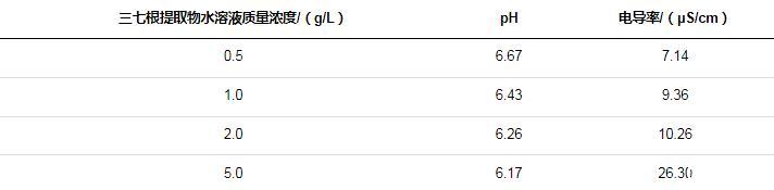 將三七根提取物配制為5 g/L的水溶液并稀釋至各待測濃度,測定其pH值和電導率,結果如表1所示。由表1可知,三七根提取物水溶液呈弱酸性,電導率較低。Russell提出可以使用電導率儀來計算溶液的離子濃度,以此來量化物質的離子性強弱。因此,三七根提取物在水溶液中的離子性較弱,屬于一種非離子表面活性劑。