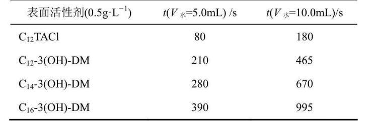 采用量筒法進行表面活性劑乳化力的測定,結果見表4。雙子表面活性劑比傳統單子表面活性劑十二烷基三甲基氯化銨[1-2,22]分出相同體積水的時間長,且隨著烷基碳鏈長度的增加,水相所分離出水量所用的時間也越長。這可能是因為在油/水界面上,吸附的表面活性劑分子之間排列越緊密,形成界面的膜強度越高。根據單分子吸附膜理論,界面張力減小,乳化性能越好,表現為從乳狀液中分離出水所用的時間越長。隨著烷基碳鏈長度的增加,碳氫鏈間的相互作用力更強,兩個表面活性劑單體分子之間的連接更加緊密,形成的界面膜強度也越高,因此烷基碳鏈長度越長的雙子表面活性劑的乳化效果越好。