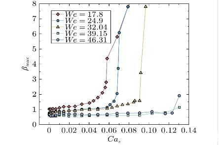 圖6描述了不同韋伯?dāng)?shù)下液滴最大無(wú)量綱拉伸系數(shù)βmax的對(duì)比趨勢(shì)。最大拉伸系數(shù)值是在式(5)的基礎(chǔ)上求取:βmax=Hmax/D0,其中Hmax為液滴在撞擊過程中達(dá)到的最大拉伸高度。可以發(fā)現(xiàn),當(dāng)實(shí)驗(yàn)條件設(shè)定為低韋伯?dāng)?shù)和高電毛細(xì)數(shù)時(shí),液滴的最大拉伸系數(shù)明顯增大,甚至在此條件下部分液滴產(chǎn)生了射流模態(tài),所形成的液絲長(zhǎng)度超出了上極板的界限。除此之外,前三組韋伯?dāng)?shù)下的液滴撞擊實(shí)驗(yàn)結(jié)果分析,得到結(jié)論:韋伯?dāng)?shù)的增大,直接導(dǎo)致液滴達(dá)到噴射狀態(tài)所需的電毛細(xì)數(shù)相對(duì)應(yīng)增大。
