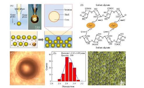 為了實現(xiàn)一步法制備大小均勻、尺寸可控、壁厚可調(diào)、生物相容的水/水微囊,需要設計同軸微流控器件,如圖1(A)所示。內(nèi)相黃原膠水溶液由內(nèi)管注入微流控器件;外相海藻酸鈉水溶液,由外管注入微流控器件。內(nèi)相在外相的剪切下形成液滴,同時外相在重力作用下脫離管口生成水包水的水/水微囊,并進一步通過鈣離子交聯(lián)海藻酸鈉水凝膠網(wǎng)絡,如圖1(B)所示。由于微流控器件對內(nèi)外相的精準調(diào)控,水/水微囊在光學顯微鏡下具有清晰穩(wěn)定的核殼結構圖1(C),平均尺寸(D)為(2.83±0.09)mm圖1(D)。該方法制備水/水微囊具有器件結構簡單、操作便捷、一步法成型、微囊尺寸均一可控、核殼結構穩(wěn)定、無需后處理等優(yōu)點圖1(E)。