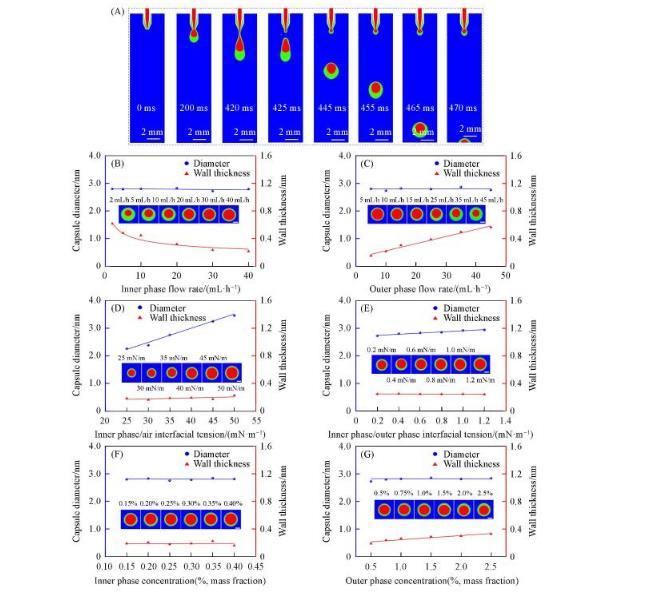 數(shù)值模擬與實驗結果具有較好的一致性,數(shù)值模擬內(nèi)相/外相流速對水/水微囊直徑和壁厚的影響,得出了與實驗數(shù)據(jù)一致的規(guī)律,即水/水微囊的直徑基本不隨內(nèi)相/外相流速的變化而變化,而水/水微囊壁厚隨內(nèi)相流速增加或外相流速減小都將減小,如圖4(B)和(C)所示。與實驗相比,數(shù)值模擬可以更系統(tǒng)地調(diào)節(jié)各個參數(shù),如外相/空氣界面張力、內(nèi)相/外相界面張力對微囊直徑和壁厚的影響。隨著外相/空氣界面張力的增加,水/水微囊直徑成比例增加,這是由于外相/空氣界面張力使微囊懸掛在管口,重力使微囊脫離管口,當外相/空氣界面張力增加,需要的重力相應增加,造成水/水微囊直徑增加。當內(nèi)相/外相界面張力增大時,水/水微囊直徑略有增加。