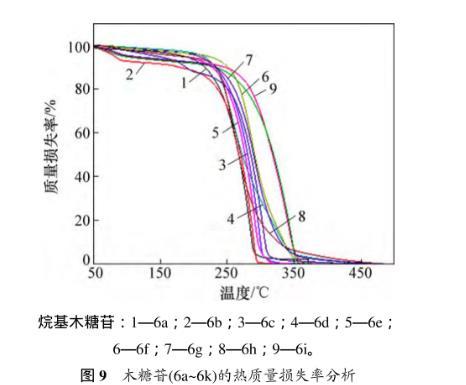 圖9所示為熱質(zhì)量損失結(jié)果。從圖9可見:烷基吡喃木糖苷6a~6i均只有1個質(zhì)量損失臺階,起始分解溫度分別為157.9,177.3,172.6,162.3,164.1,169.5,151.7,170.4和208.9℃左右,最大分解速率時的溫度依次為283.2,287.8,296.6,257.9,290.4,286.1,301.9,262.7和339.8℃。糖苷6a~6i熱分解完時的溫度分別為303.1,298.1,329.6,365.5,320.4,340.2,332.0,374.6和356.2℃。總質(zhì)量損失率為94.9%,89.9%,91.0%,91.9%,95.3%,96.6%,89.6%,88.5%和91.5%。結(jié)果表明:合成的烷基吡喃木糖苷在150℃以下是穩(wěn)定的。