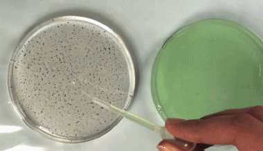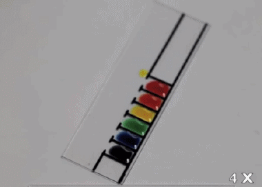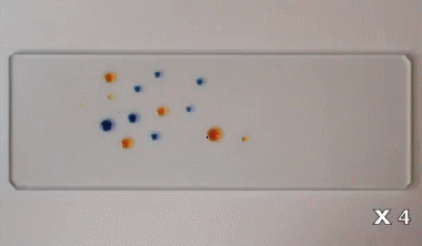 這個難度比較高,不過現象非常有意思。在這里使用的是含有丙二醇和水的液體食品色素,這些液滴經過不同程度的稀釋。在非常潔凈的玻璃片上,它們因為蒸發而產生表面張力的變化,從而出現彼此“追逐”的現象。詳情: