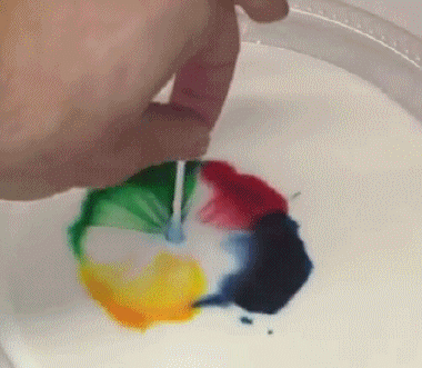 液體食品色素滴在牛奶上,然后把蘸了洗潔精的棉簽杵進去,欣賞食品色素的流動。