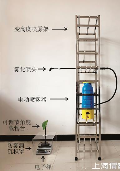 流失點和最大穩(wěn)定持留量的測定裝置見圖2。將噴霧器固定在可變高度噴霧架上,噴頭與地面垂直,分別設(shè)置噴嘴下沿與葉片中心垂直距離50、100、150和200 cm 4種噴霧距離,噴霧器中裝入水,進(jìn)行噴霧時關(guān)閉靜電功能。測定裝置由載物臺、電子秤和防霧滴沉積罩3部分組成。其中載物臺可進(jìn)行90°以內(nèi)的傾斜角度調(diào)整;電子秤精度為0.01 g(YH-50002型,東陽市英衡智能設(shè)備有限公司);防護(hù)罩為透明的亞克力材料制成,防止霧滴沉積到電子秤上。