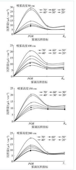 圖5不同噴霧距離和葉傾角條件下的流失點(POR)和最大穩定持留量(Rm)