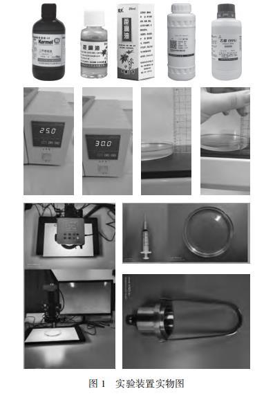 為了還原物理現(xiàn)象,初步探究液滴爆炸的原因,本文首先進(jìn)行了預(yù)實(shí)驗(yàn)。實(shí)驗(yàn)中所用到的物品包括:醫(yī)用75%酒精和蒸餾水混合形成水混合物液滴,家用菜籽油用作油池,普通藍(lán)墨水染色。在室溫環(huán)境下進(jìn)行實(shí)驗(yàn),預(yù)實(shí)驗(yàn)中發(fā)現(xiàn)普通藍(lán)墨水染色現(xiàn)象不明顯,改進(jìn)為采用甲基藍(lán)染色劑進(jìn)行染色。正式實(shí)驗(yàn)時(shí)準(zhǔn)備了不同種類(lèi)的水混合物(乙醇、二乙二醇丁醚),不同種類(lèi)的疏水性物質(zhì)(硅油、花生油、蓖麻油),不同厚度的疏水性物質(zhì)(5 mm、10 mm),設(shè)置合適的濃度梯度,采用恒溫水浴鍋來(lái)測(cè)定溫度。在顯微鏡下觀察液滴的運(yùn)動(dòng)過(guò)程,精準(zhǔn)測(cè)定液滴大小,利用注射器定量控制滴入液滴的體積,再利用黏度計(jì)測(cè)量黏性系數(shù),并對(duì)實(shí)驗(yàn)誤差進(jìn)行了修正。