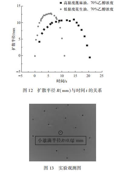 故本文將選擇不同黏度梯度的疏水性物質(zhì)進行實驗。采用蓖麻油和花生油進行試驗,蓖麻油的黏度(1452.91 mm2/s)遠大于花生油(108.34 mm2/s),當(dāng)乙醇濃度為70%時,在蓖麻油上最終液滴的半徑接近0.01 mm,遠小于對應(yīng)花生油的測量值0.0743 mm.分析實驗數(shù)據(jù)得到結(jié)論:微觀上黏度增大會導(dǎo)致最終形成的液滴減小,宏觀上黏度越大,液滴爆炸總時間越長,最大擴散半徑越小。