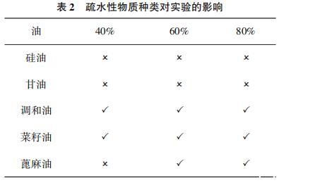 接下來再探究疏水性物質(zhì)種類對液滴爆炸的影響,疏水性物質(zhì)有很多種,在實際實驗中不可能將所有的疏水性物質(zhì)一一嘗試,所以要找出選擇有限疏水性物質(zhì)種類的標(biāo)準(zhǔn)。本文開始選擇了五種疏水性物質(zhì)進行嘗試,實驗表明(如表2所示):對于硅油池與甘油池,沒有一個案例表現(xiàn)出液滴的擴散;對于食用調(diào)和油、菜籽油池,40%、60%和80%乙醇溶液液滴在降落到油池上后均立即自發(fā)地進行擴散;對于蓖麻油池只有40%乙醇溶液無液滴爆炸現(xiàn)象產(chǎn)生。由此可以得出液滴只在特定種類疏水性物質(zhì)上“爆炸”,并猜測與油的黏性有關(guān)。