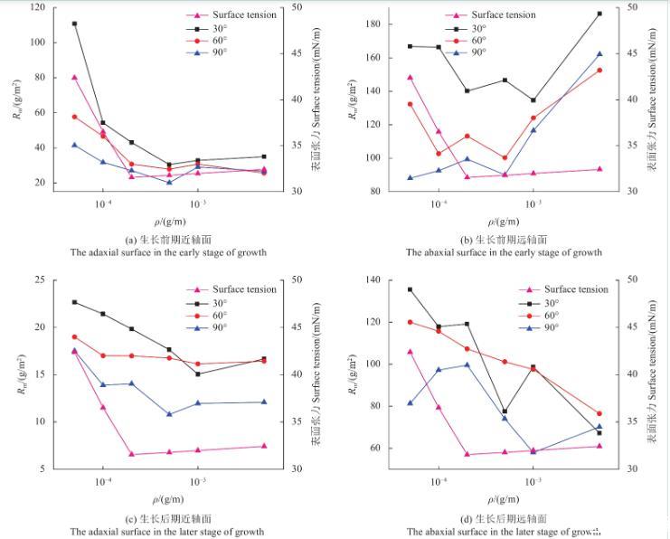 圖6為不同濃度SilwetL-77溶液在蘋果葉片近、遠(yuǎn)軸面的Rm變化規(guī)律。由圖可知,當(dāng)溶液質(zhì)量濃度低于cmc時(shí),蘋果葉片生長(zhǎng)前、后期遠(yuǎn)軸面的Rm值和表面張力均隨溶液質(zhì)量濃度的降低而減小。此外,蘋果葉片生長(zhǎng)后期近軸面只有在30°傾角時(shí)的Rm值與表面張力隨溶液質(zhì)量濃度的提高而減小,60°傾角和90°傾角時(shí)Rm值隨溶液濃度變化不大。蘋果葉片生長(zhǎng)后期遠(yuǎn)軸面Rm值和表面張力隨溶液濃度的變化與生長(zhǎng)前期基本一致。