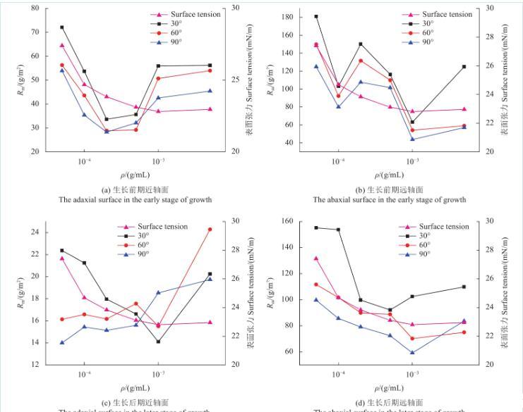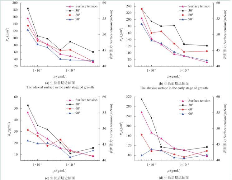 圖5為不同質(zhì)量濃度Triton X-100溶液在蘋果葉片近、遠(yuǎn)軸面的Rm變化規(guī)律。從中可以看出,不同傾角下蘋果葉片生長(zhǎng)前期近、遠(yuǎn)軸面的Rm值和表面張力均隨溶液質(zhì)量濃度的升高而不斷減小,當(dāng)Triton X-100溶液質(zhì)量濃度達(dá)到cmc時(shí),近軸面Rm值與表面張力的變化趨于平緩,而遠(yuǎn)軸面的Rm值則出現(xiàn)大幅波動(dòng)。其原因可能與Triton X-100表面活性效率高(cmc=1.32×10?4 g/mL)有關(guān),同時(shí)溶液色散分量占比會(huì)隨溶液質(zhì)量濃度的升高而提高,而對(duì)蘋果葉片遠(yuǎn)軸面表面自由能起主導(dǎo)作用的也是色散分量,以上多重因素導(dǎo)致遠(yuǎn)軸面的Rm值產(chǎn)生波動(dòng)。蘋果葉片生長(zhǎng)后期Rm與表面張力隨溶液質(zhì)量濃度的變化與生長(zhǎng)前期相似。