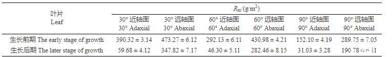 以上結(jié)果表明,蘋果葉片生長(zhǎng)前期近軸面的Rm值高于生長(zhǎng)后期,且在同一生長(zhǎng)期,蘋果葉片遠(yuǎn)軸面的Rm值遠(yuǎn)高于近軸面。此外,蘋果葉片的Rm值隨葉傾角的增大而減小。