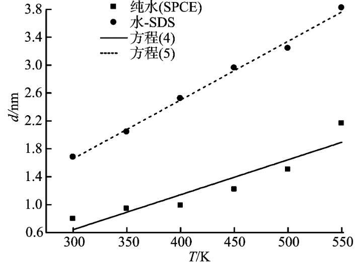 界面厚度取從水相體相密度的90%到表面活性劑體相密度的90%。模擬水分子數(shù)N1=3 000,十二烷基硫酸鈉數(shù)N2=20,在溫度T=300、350、400、450、500和550 K時,模擬得到界面厚度,將其與純水體系的界面厚度對比,如圖9所示。從圖9可以看出,水—表面活性劑體系的界面厚度隨溫度的增加而增加,而且和純水體系的界面厚度對比可知,水—表面活性劑體系的氣—液界面厚度明顯增大。同時,對純水體系和水—表面活性劑體系的界面厚度模擬值進(jìn)行擬合可分別得到式(4)和(5)。