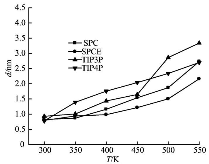 根據(jù)“10-90”法則進(jìn)行計算,分別求得SPC、SPCE、TIP3P和TIP4P在300~550 K的界面厚度如圖6所示。