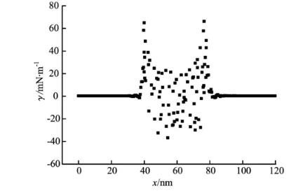 模擬水分子數(shù)N1=3 000,十二烷基硫酸鈉數(shù)N2=20,溫度T=300 K,水—表面活性劑體系的局部界面張力見圖10。由圖10可知,從汽相主體向液相過渡過程中,界面張力值逐漸增加,在氣—液界面區(qū)達(dá)到峰值;在液相主體又在零值附近波動。
