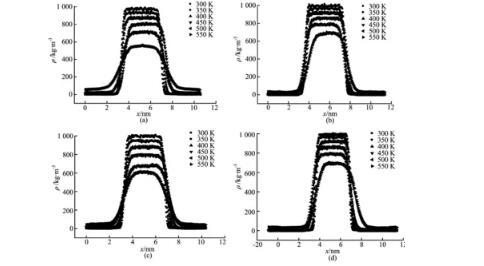 模擬分子數(shù)N=1 327,四種水分子模型分別在溫度T=300、350、400、450、500和550 K時,模擬得到的密度分布如圖4所示。從圖4可以看出,曲線可以劃分為三個部分,分別為汽相主體、液相主體以及氣—液界面層。隨著溫度的增加,液相主體密度逐漸降低,氣相主體密度逐漸升高,氣—液界面區(qū)域逐漸變寬。