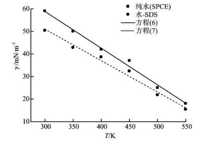 從圖11可以看出,水—表面活性劑體系的界面張力隨溫度的升高而降低,而且加入十二烷基硫酸鈉后水的界面張力明顯降低。對純水體系和水—表面活性劑體系的界面張力模擬值進(jìn)行擬合可分別得到式(6)和(7)。