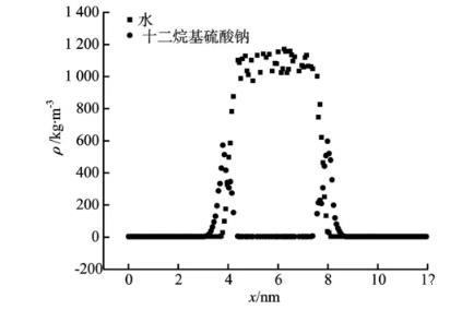 向純水中加入十二烷基硫酸鈉表面活性劑,水分子3 000個,十二烷基硫酸鈉20個,模擬得到300 K下水—表面活性劑體系的密度分布,如圖8所示。由圖8可見,對于只有水的體系來說,其密度變化基本是符合由汽相到液相逐漸增加的趨勢,而對于加入的表面活性劑十二烷基硫酸鈉的體系來說,其密度的變化情況與只有水的體系有明顯的不同。從圖8可以看出,在氣—液兩相的過渡區(qū)域,加表面活性劑的體系密度出現(xiàn)明顯的增長。