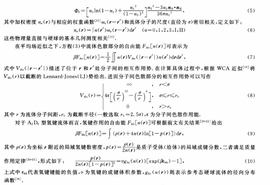在微擾論的框架下,體系的過量自由能Fex[n(r)]可被表示為硬球、色散和氫鍵作用3部分的貢獻之和,形式如下:
