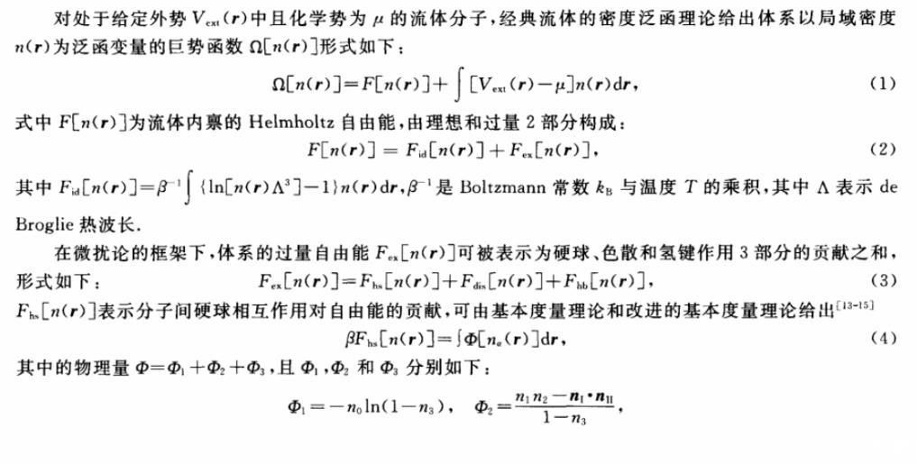 對處于給定外勢Vext(r)中且化學(xué)勢為μ的流體分子,經(jīng)典流體的密度泛函理論給出體系以局域密度n(r)為泛函變量的巨勢函數(shù)Ω[n(r)]形式如下: