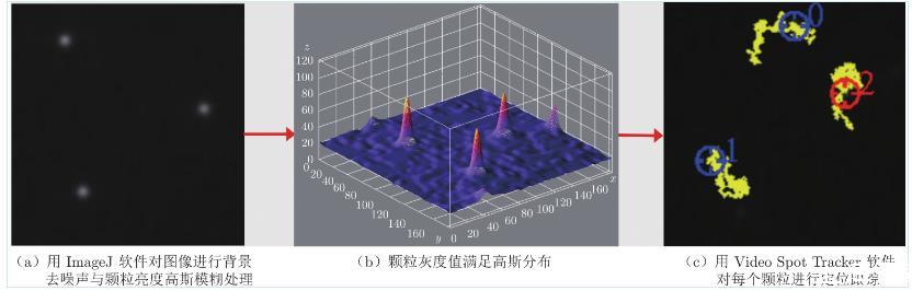 實驗采用Olympus顯微鏡(配備60倍物鏡)觀察顆粒在膜上的布朗運動,同時利用電子增益高速攝像機(Andor 897 EMCCD)進(jìn)行拍攝。每個視頻拍攝時間為200 s,幀頻為0.05 s,曝光時間5 ms,圖像尺寸為300像素×300像素,分辨率為0.26μm/m。采集原始圖像中的顆粒灰度值不符合標(biāo)準(zhǔn)高斯分布,因此使用圖像處理軟件ImageJ對圖像進(jìn)行背景去噪聲(Background Subtraction)和高斯模糊(Gauss-ian Blur)處理(圖3(a)),使顆粒灰度值達(dá)到標(biāo)準(zhǔn)高斯分布(圖3(b))。之后用Video Spot Tracker軟件定位每個顆粒的灰度峰值(圖3(c)),即顆粒質(zhì)心,定位誤差僅為0.5像素,進(jìn)而對顆粒二維運動軌跡(平面)進(jìn)行實時跟蹤。軟件自動將顆粒在每一時刻的像素位置坐標(biāo)存入計算機中,使用MATLAB計算顆粒在不同時間間隔Δt內(nèi)沿和方向的位移,計算公式如下: