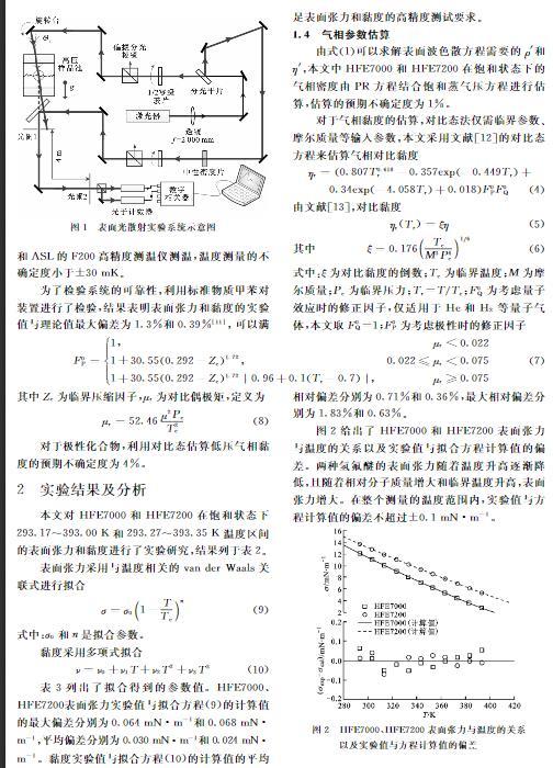 本文對HFE7000和HFE7200在飽和狀態下293.17~393.00 K和293.27~393.35 K溫度區間的表面張力和黏度進行了實驗研究,結果列于表2。