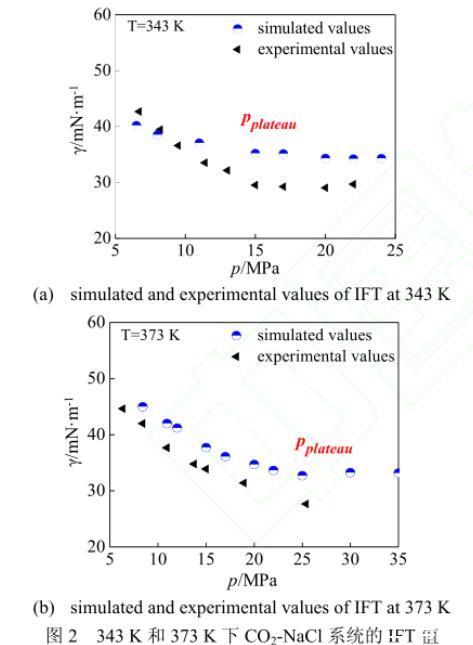 本文分別模擬了343 K和373 K的各壓強下鹽濃度為1.89 mol·L-1的CO2-NaCl系統,IFT的計算結果示于圖2。由圖2可以看出,模擬所得的IFT值與Chalbaud等的實驗數據吻合較好。在溫度為343 K時[圖2(a)],IFT值隨著壓強的不斷升高,其減幅逐漸下降,最終在壓力平衡點pplateau=15 MPa之后達到穩定值34 mN·m-1。373 K時[圖2(b)]的IFT值變化與343 K時極為相似,IFT值同樣隨著壓強的升高而下降,且下降速度不斷趨于平緩,由于高壓情況下實驗設備等因素受限制,實驗方法尚未得到25 MPa以上的數據點,故在實驗壓強范圍內并未觀測到壓力平衡點。而本文應用分子模擬的方法,成功模擬了25~35 MPa下的CO2-NaCl系統,觀測到壓強在pplateau=25 MPa之后達到穩定值33 mN·m-1。