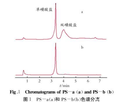 從色譜圖及色譜數據分析結果得知:PS-a和PS-b均含有單磺酸鹽和雙磺酸鹽,但兩者所含單、雙磺酸鹽的量差別較大;如果以峰面積為評價標準,樣品PS-b中幾乎不含雙磺酸鹽部分,而樣品PS-a中單、雙磺酸鹽所含比例相當,約為1∶1。
