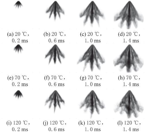 圖4不同環(huán)境溫度和噴霧開始后時刻下甲醇的噴霧形態(tài)