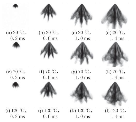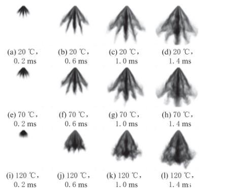 圖6不同環(huán)境溫度和噴霧開始后時刻下正丁醇的噴霧形態(tài)
