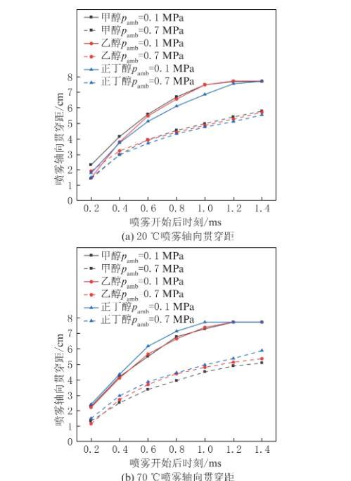 在試驗中發(fā)現(xiàn),高溫高壓的環(huán)境對噴霧形態(tài)產(chǎn)生了較大的改變,相比于單種工況,環(huán)境溫度和背壓共同對噴霧形態(tài)有著更復(fù)雜的影響。圖8為3種醇類燃料在不同溫度(20℃、70℃、120℃)、不同背壓(0.1 MPa、0.7 MPa)的環(huán)境下,噴射壓力為20 MPa時的噴霧軸向貫穿距的變化。