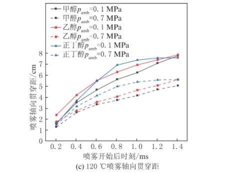 環(huán)境溫度升高至70℃、120℃時,正如圖8(b)和圖8(c)呈現(xiàn)出的,正丁醇的噴霧軸向貫穿距高于甲醇和乙醇,這與常溫常壓的環(huán)境條件下完全相反。盡管正丁醇的潛熱較低,但環(huán)境溫度和壓力的升高使甲醇和乙醇的過熱度高于正丁醇,進(jìn)而引發(fā)更高的顯熱,提升了甲醇和乙醇的蒸發(fā)率,導(dǎo)致醇束發(fā)展緩慢。