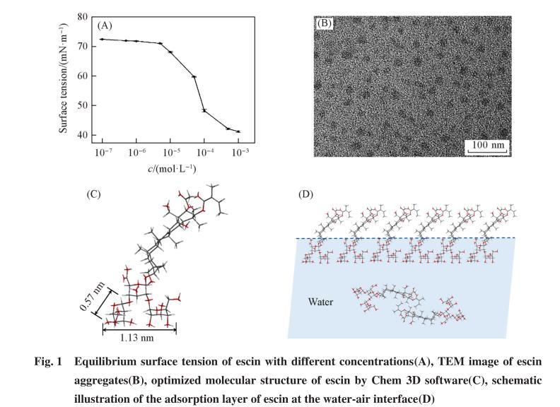 首先,采用吊片法測量了不同濃度七葉皂素溶液的表面張力.由于七葉皂素溶解度的限制,當濃度超過1×10-3mol/L時會有少量固體物質析出,影響測試結果,故表面活性測試的濃度范圍為1×10-7~1×10-3mol/L.如圖1(A)所示,隨著七葉皂素濃度的增加,表面張力呈現先基本不變、后快速下降、最后達到平衡的3個階段.這是由于濃度低于1×10-5mol/L時,只有少量七葉皂素分子吸附在氣-液界面,表面張力基本不變;然后隨著濃度增加,越來越多的分子遷移并吸附在氣-液界面,使溶液表面張力快速下降;當分子在界面吸附達到飽和(5×10-4mol/L)后,開始在體相聚集形成膠束,表面張力不再改變.可知,七葉皂素的臨界膠束濃度(cmc)為5×10-4mol/L,對應的表面張力(γcmc)為42.1 mN/m.圖1(B)為七葉皂素形成聚集體的TEM照片,膠束大小約為20 nm.
